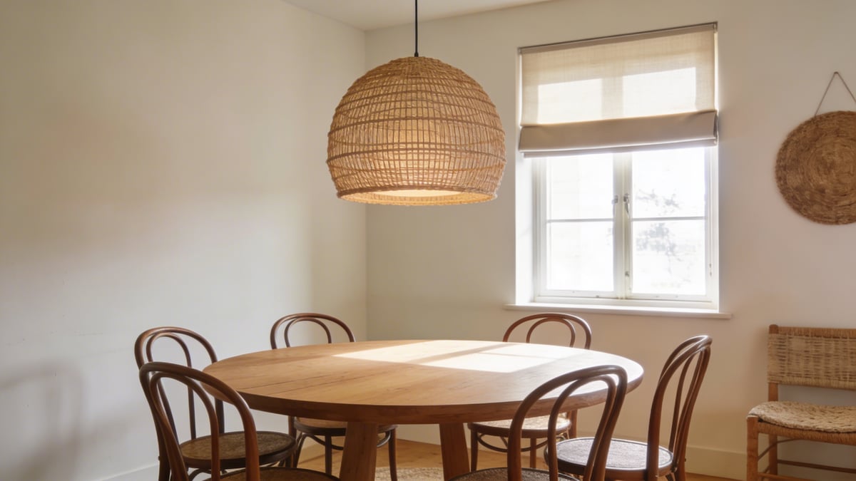 Magia światła: pleciona lampa wisząca i roleta rzymska w duecie
