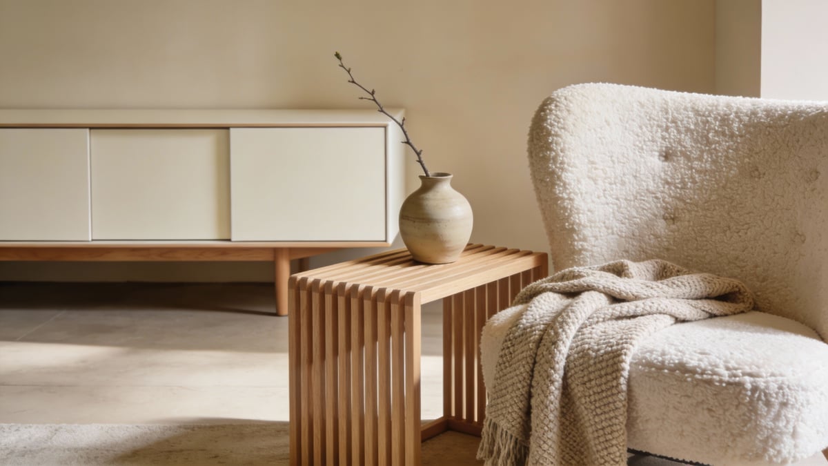 Meble w stylu japandi często czerpią z japońskiej stolarki, gdzie widoczna struktura drewna jest elementem dekoracyjnym. Stolik z lamelami (inaczej żaluzjowy) to tego doskonały przykład. Pionowe lub poziome listewki tworzą grę światła i cienia, dodając wnętrzu tekstury i lekkiej, organicznej dynamiki. To znacznie ciekawsza alternatywa dla gładkich, laminowanych blatów.