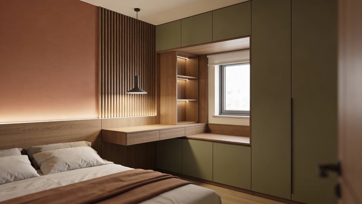 Kolory ziemi to coś znacznie więcej niż tylko „beże i brązy”. To cała gama odcieni zaczerpniętych prosto z natury: od ciepłych, wyprażonych słońcem piasków (RAL 1015, ecru) przez rdzawe ochry i terakoty (np. farba Magma od Śnieżki), po chłodniejsze, stonowane zielenie (jak Forest Biome od Dulux) i głębokie, szarawoniebieskie gliny. Dlaczego są idealne dla sypialni z biurkiem? Bo uspokajają układ nerwowy, sprzyjają koncentracji i nie męczą wzroku – są więc doskonałe zarówno do relaksu, jak i pracy.