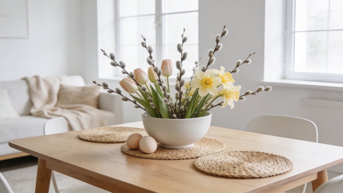 To serce skandynawskiej wiosny. Chodzi o to, by przynieść kawałek budzącego się ogrodu lub lasu do domu. Dekoracje z bazi i kwiatów są niepowtarzalne, delikatne i pełne życia. Nie muszą to być drogie, egzotyczne rośliny. Najpiękniejsze są często te najprostsze, zebrane podczas spaceru.